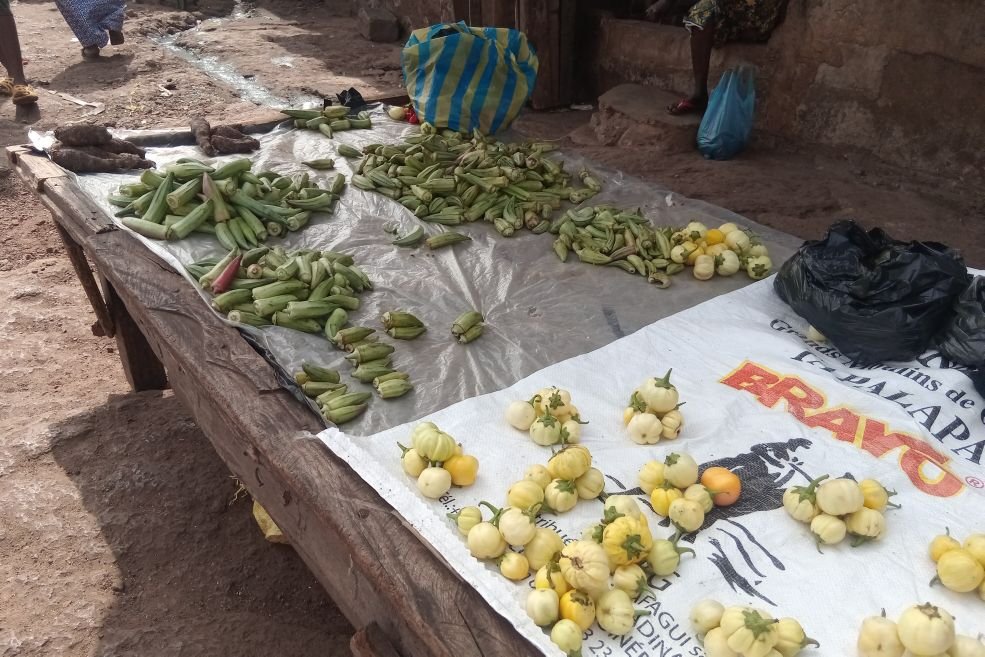 Nos constatations sur place montrent que les vendeuses proposent des tas de trois gombos à 2 000 francs guinéens, et un seul à 1 000 francs guinéens. Une aubergine blanche se vend également à 1 000 francs guinéens.